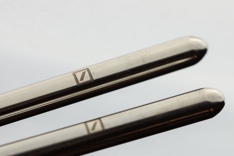 Für die Deutsche Bank gravierten wir das berühmte, sehr reduzierte Logo auf polierte Edelstahl-Essstäbchen.