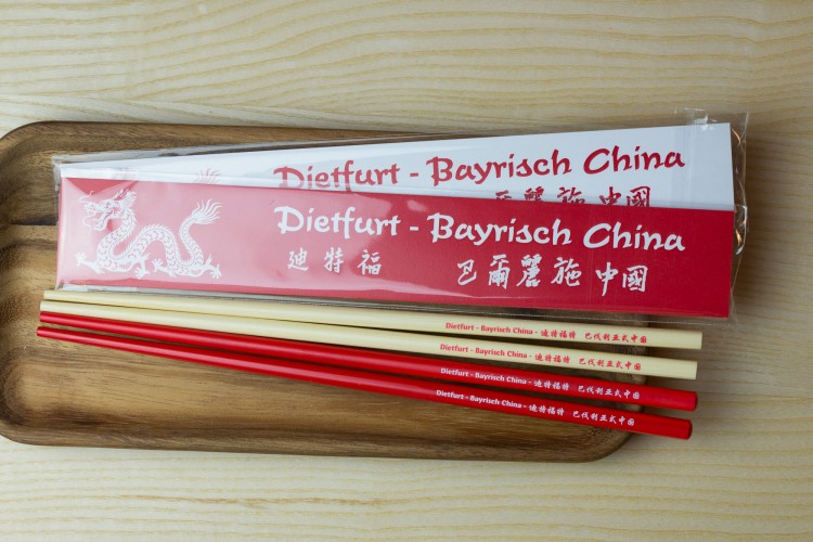 Seit dem Mittelalter trägt die bayrische Stadt Dietfurt den Spitznamen „Bayrisch China“. Heute gibt es einen vielfältigen bayrisch-chinesischen Kulturaustausch zwischen Dietfurt und dem großen Reich der Mitte. Das großartige Stadtmarketing bestellte bei uns Essstäbchen in zwei verschiedenen Ausführungen: naturfarbene Essstäbchen mit rotem Aufdruck und rot lackierte Chopsticks mit weißem Aufdruck - verpackt als handliches Giveaway mit passend gestaltem Kartoneinschieber. 谢谢! Danke für den schönen Auftrag.