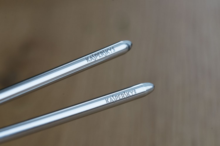 Edelstahl-Chopsticks mit Logogravur für KASPERSKY lab, einem Hersteller von Antivirenprogrammen. Auf den glänzenden Metallstäbchen erscheint das Logo in dezentem Grau.