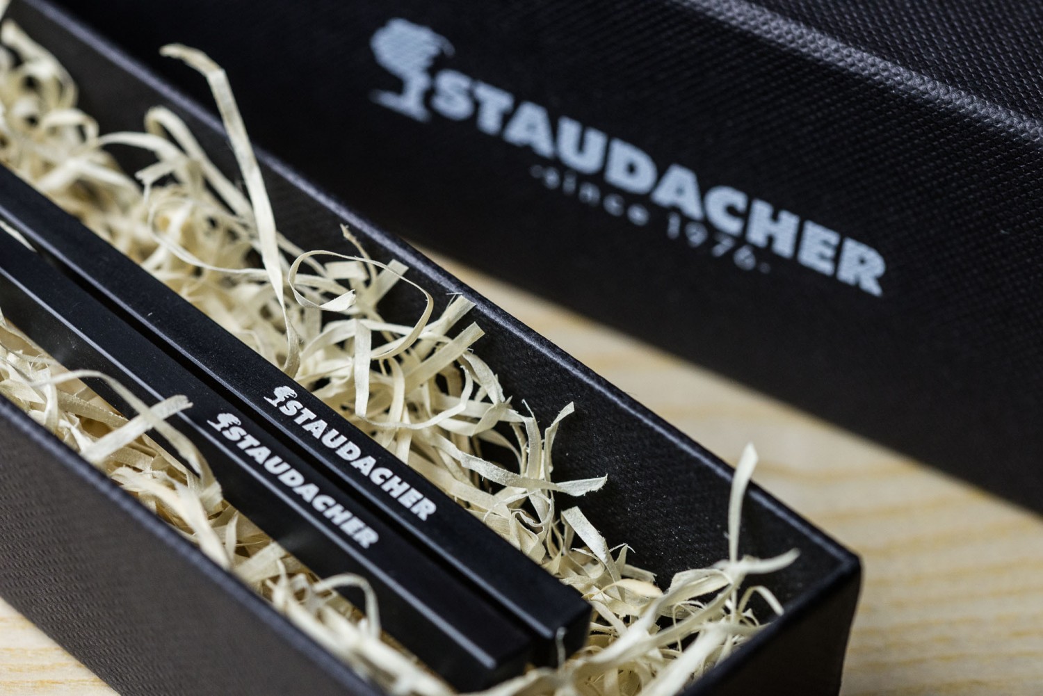 Die real media technic Staudacher GmbH ist eine Full-Service-Medienagentur aus Nürnberg. Die kantigen PPS-Kunststoff-Essstäbchen wurden mit dem einprägsamen Baumlogo versehen und setweise in schwarze Geschenbboxen mit einer natürlichen Holzwoll-Füllung verpackt. Das Staudacher-Logo wurde per Tampondruck auch nochmals aussen auf den Karton gedruckt.